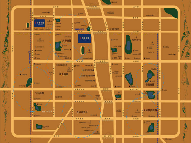 美特好、山姆士、华宇购物中心,滨河体育中心、省博物馆、省政府、市政府、汾河公园、森林公园、心血管医院、市二院、太原市实验小学、阳光双语小学、太原市外国语学校等