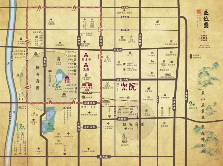 万科紫院是太原万科紫系高端产品线上;继“紫台”、“紫郡”后的第三个作品。以“紫”开名,是对紫系产品系列延伸的寓意,同时也是对紫系建造建筑新国学的时代理念的传承,承续着太原万科紫系豪宅国学的概念。项目位于迎泽区迎泽街东,原华北广电学院旧址。项目总占地面积约7.5万平米,总建筑面积约21万平米,北侧紧邻五龙口街,东侧为城市快速路东中环,南侧为规划中的五龙口南巷,西侧紧邻五龙花园未来有规划市政路;根据规划,迎泽大街未来将东穿火车站与东中环相连,项目南侧红线距离迎泽街东延约200米。项目总体规划呈现”两坊一市”的布局。