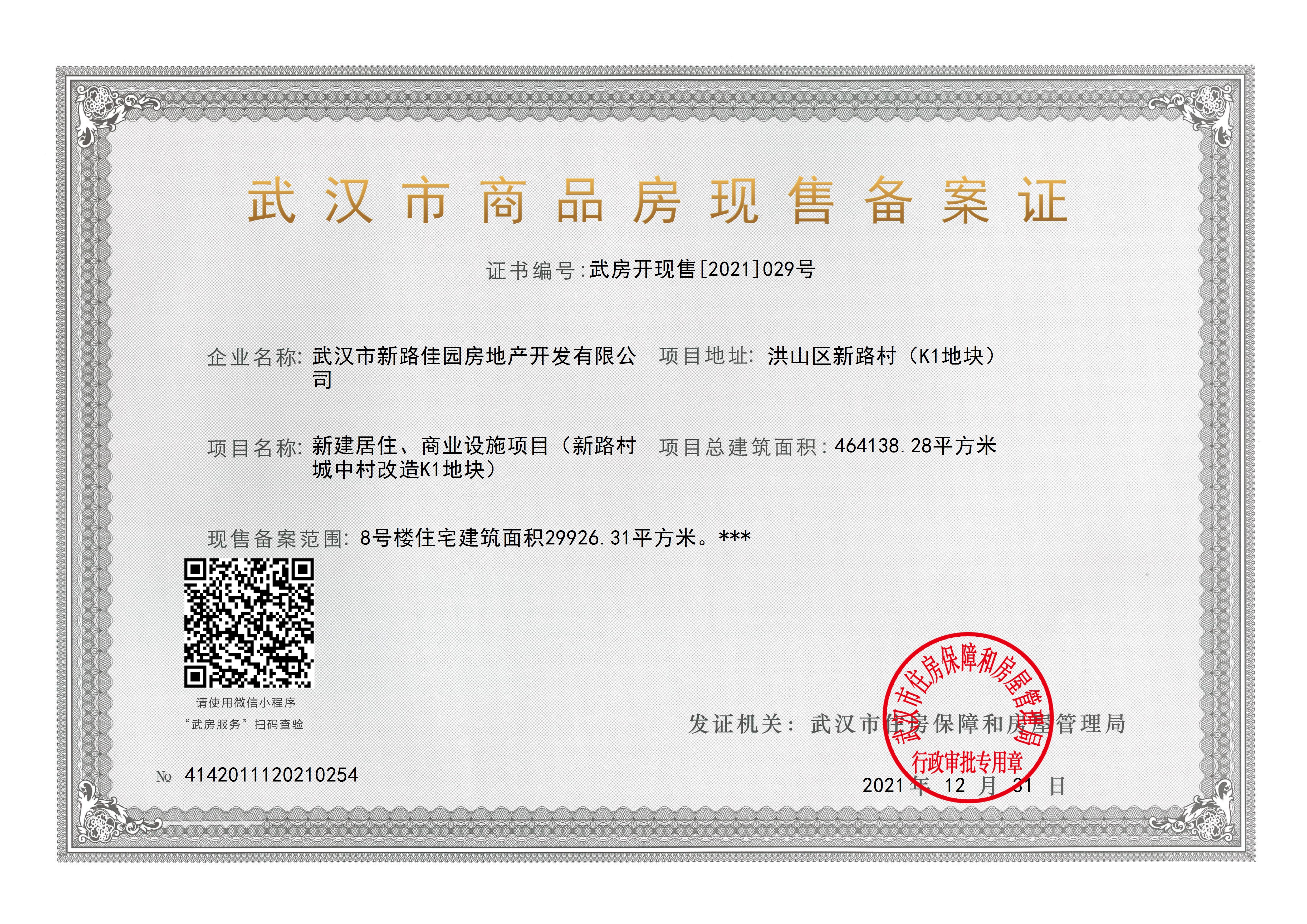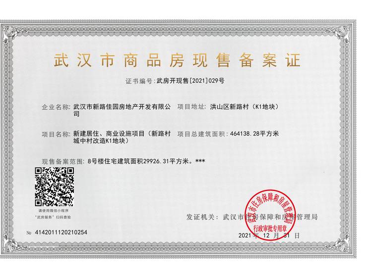 - 武房开现售[2021]029号 详情发证时间 2021-12-31绑定楼栋8号楼住宅建筑面积29926.31平方米。 ******证件照片