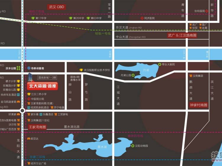 北大资源·首座位于汉阳郭茨口琴台大道与龙阳大道交汇点,知音桥(汉江二桥)的下桥处,是汉口区域进入汉阳区域的桥头堡,是连接汉阳王家湾及桥口宗关的黄金连接轴,其地段升值潜力巨大。