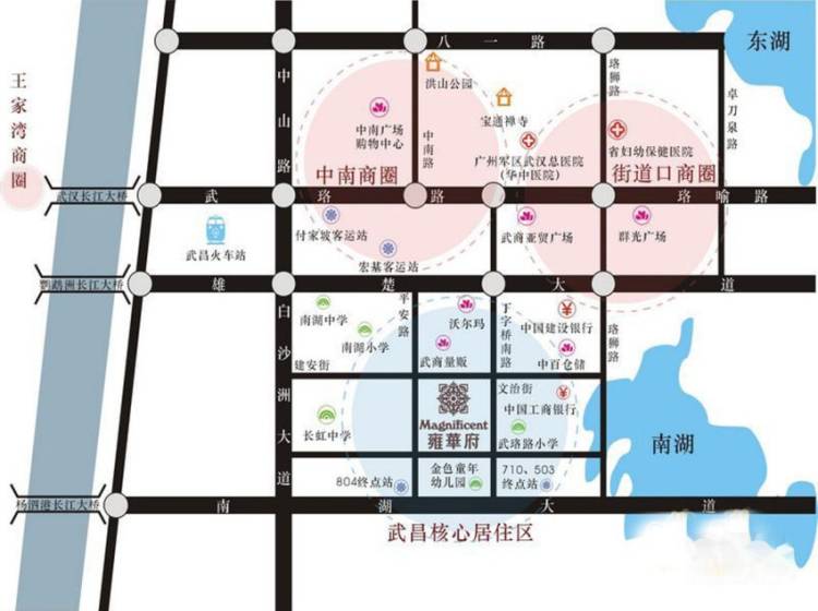 公交站点:建安街东公交站(804)文昌街公交站(503、710)新千家街公交站(72、74、916、543、570、587、609) 招商雍华府位于武汉洪山区南湖组团,西频珞梁路,南临南湖路,是武昌南湖新城之中央枢纽,享中南商圈、街道口商圈、东湖高新开发区三重辐射。项目周边交通便捷,配套成熟:数十条公交线路环绕,规划中双地铁线、鹦鹉长江大桥及二环线近在咫尺。到武昌火车站仅需3.1公里、到达中南商圈、街道口商圈仅需十分钟左右。更是涵盖武汉理工、武大、华师等多所高校,形成了成熟生活区繁华便捷而幽雅知性的生活氛围。 招商雍华府位于武汉洪山区南湖组团,西频珞梁路,南临南湖路,是武昌南湖新城之中央枢纽,享中南商圈、街道口商圈、东湖高新开发区三重辐射。项目周边交通便捷,配套成熟:数十条公交线路环绕,规划中双地铁线、鹦鹉长江大桥及二环线近在咫尺。到武昌火车站仅需3.1公里、到达中南商圈、街道口商圈仅需十分钟左右。更是涵盖武汉理工、武大、华师等多所高校,形成了成熟生活区繁华便捷而幽雅知性的生活氛围。