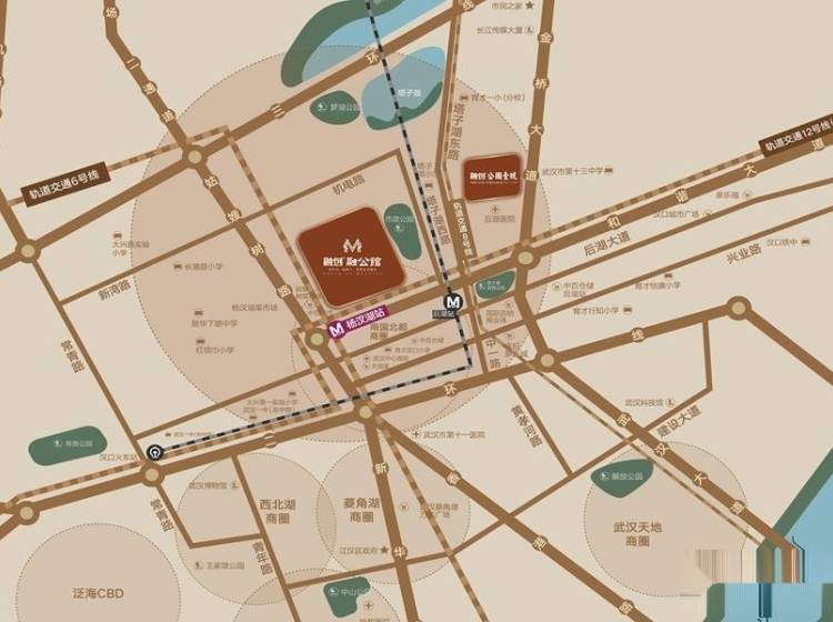 从武广出发,进入解放大道,行驶630米,左转进入新华路,行驶1.6公里进入建设大道,行驶1.9公里,左转进入黄孝河路,行驶1.9公里进入发展大道,行驶170米进入后湖大道,行驶660米融创融公馆,即在江岸区和谐大道以北,地铁6号线杨汊湖站200米处。