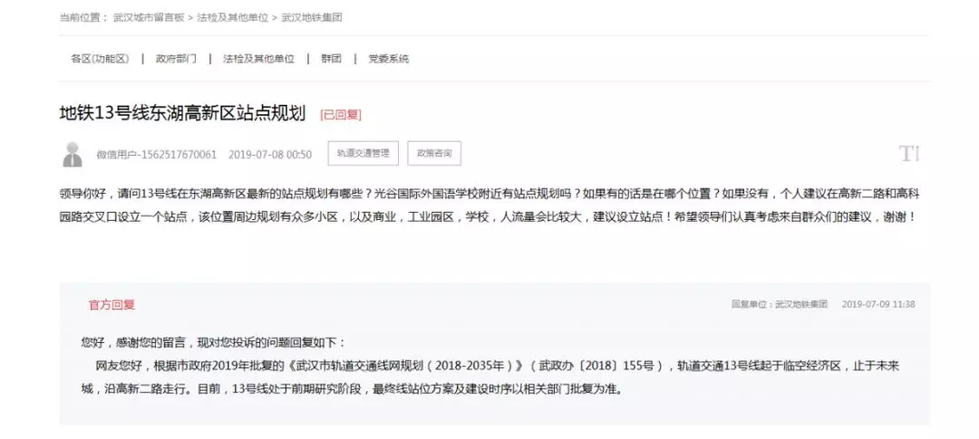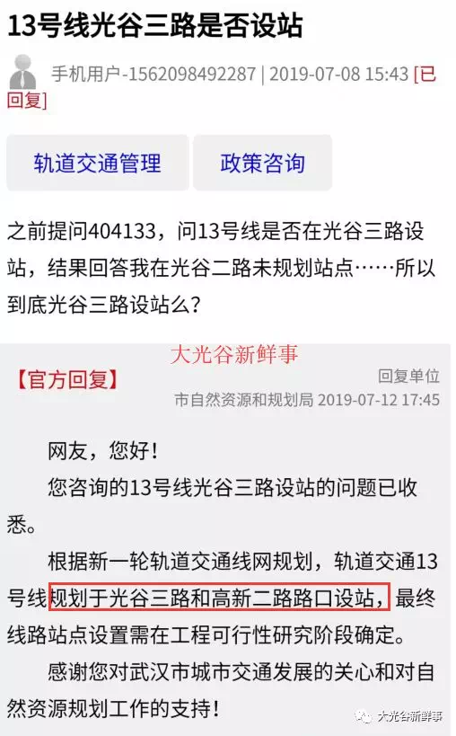 大光谷新鲜事7月12日从武汉城市留言板获悉,根据新一轮轨道交通线网规划,轨道交通13号线规划于光谷三路和高新二路路口设站,最终线路站点设置需在工程可行性研究阶段确定。