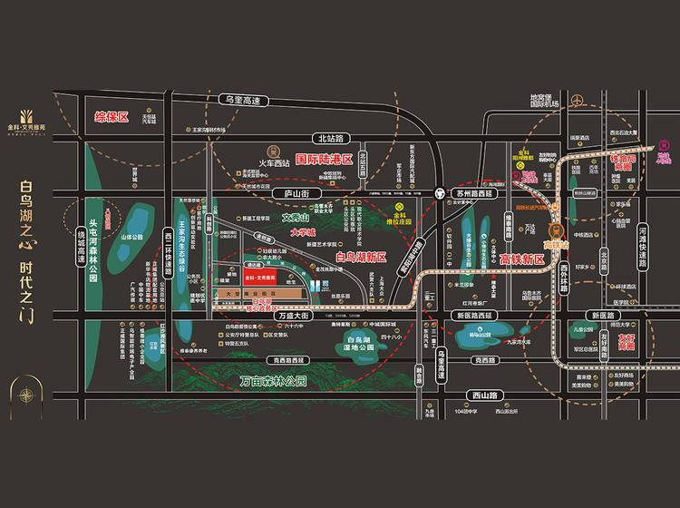金科·文秀雅苑 金科·文秀雅苑 ,项目地处经济技术开发区科创路东二巷,紧邻白鸟湖CBD核心商业带和金茂丝路乐园小镇距离较近金科·文秀雅苑东侧是坡地公园,门前就是万达,我们项目的总占地面积约14828㎡,总建筑面积51487平方米。住宅是5栋,就是1#、2#、3#,4#,5#,S1和S2是、配套商业,是白鸟湖核心政务区里的稀缺住宅项目,规划地库停车位350个。