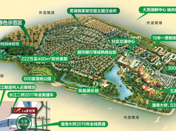 目前,芜湖碧桂园已经初具规模, 家门口的15年一站式至优教育、五星级标准酒店、社区超市已开业、商业广场已动工,住宅已成功开发龙湖上品、三山水韵、双潭映月、翠堤春晓、江心环玉苑区,部分业主已经成功入住,社区居住氛围逐渐浓厚。随着后期项目的开发和更多业主入住,一座成熟的高品质城市岛居生活大城即将形成。