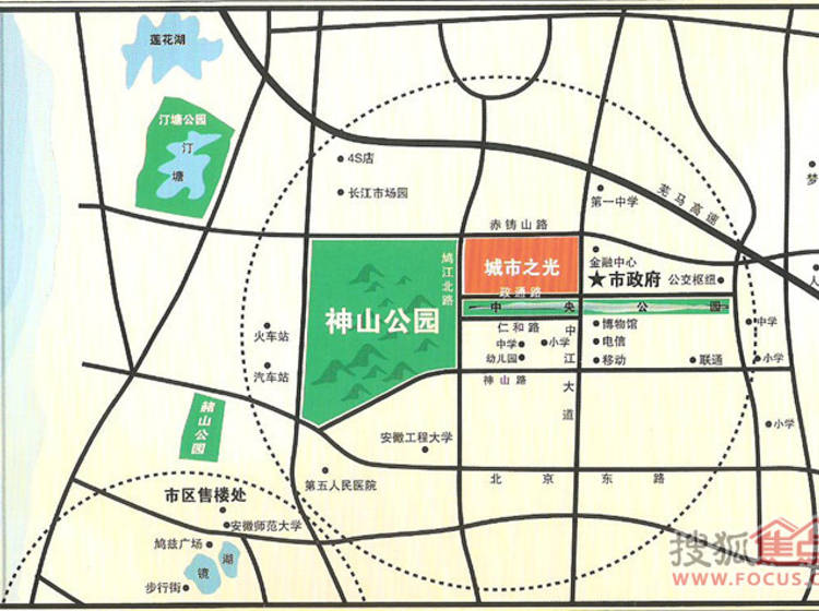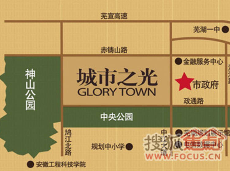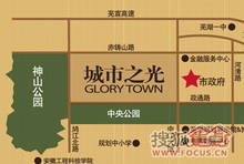 城市之光项目位于芜湖市政务新区,东侧邻中江大道,西侧鸠江北路,可眺望神山景区,南靠政通路,中央公园--城市中心绿化带。占地面积约1100亩,规划总建筑面积约为112万平方米,分为A、B、C、D、E五个地块开发,项目规划建设打造112万方皖江首席CBD城市综合体,成为芜湖乃至皖江地区的国际化标准商务中心、国际化标准交流中心、国际化标准商业中心,国际化标准生活流。7路、35路、40路、42路、45路到“政务中心”站或15路、35路到“光明”站,交通方便。