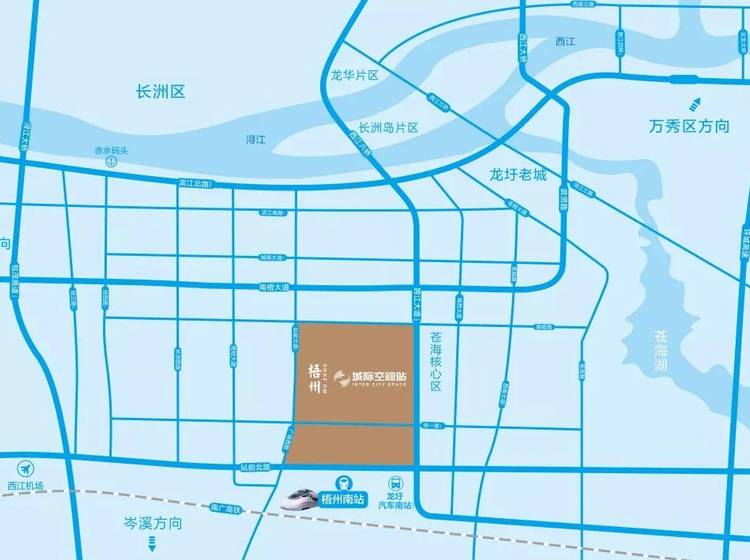 3000平方米规划国际连锁品牌幼儿园用地、红十字会苍海分院、梧州南站、梧州客运站、绿地双子塔、绿地缤纷城、铂瑞酒店