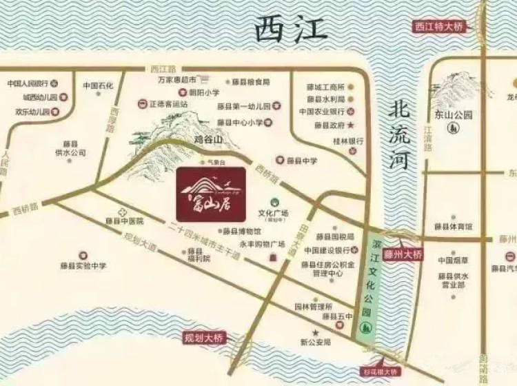 富山居位于藤县河西杉木冲,该地段是藤县重点发展的新城区,称为田寮新区,毫无疑问田寮新区是藤县撤县设市, 发展前景的核心地块。