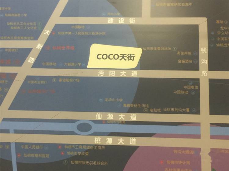 COCO天街——6万方商业综合体,坐拥沔阳大道仙商以东200米处少有地段,商业地上7层,地下2层;商业面积4万余方,住宅面积2万余方,停车位约500余个,总投资达3亿元,打造仙桃商业新名片