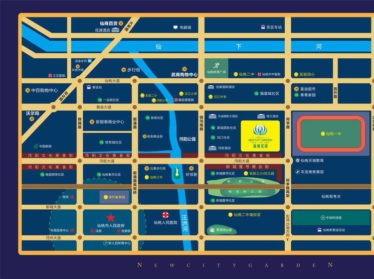 新城花园社区紧邻仙桃重点教育配套“仙桃一中”, 实验三小、四小、沔阳小学、三中、都在家门口,名校环抱与人文氛围的融合,让您的孩子成长先进一筹。项目对口汉江小学、仙桃二中(南校区)。