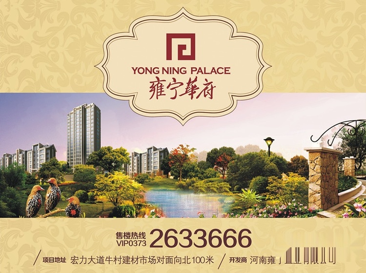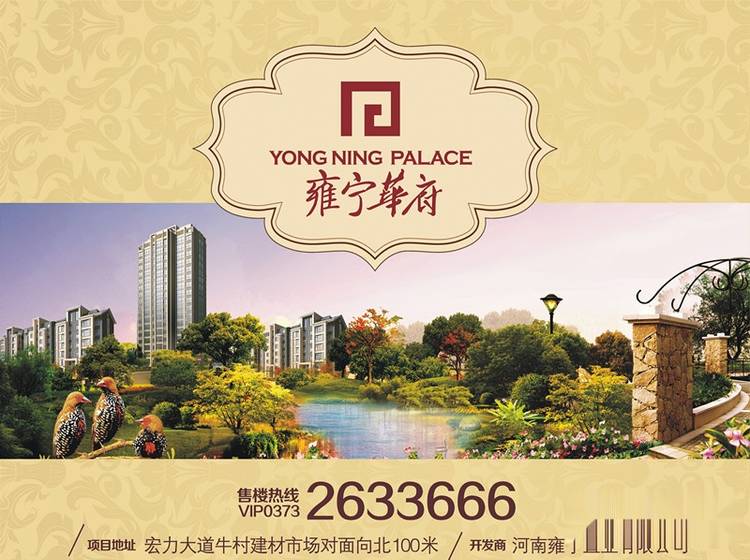 雍宁华府由河南雍宁置业有限公司开发,雍宁华府位于新乡市宏力大道牛村建材市场对面向北100米,雍宁华府的主力户型有两居85平米,三居110-135平米 宏力大道旁 精工建筑群 榜样生活区;宏力大道,城市主干道,贯穿东西,连接城市要脉;雍宁华府,宏力大道旁,配套成熟,交通便利.周边商业繁华,企业林立,教育完善.公交线路畅通全城,5即可抵达市中心,无论读书、生活、出行,尽享便利,是城市宜居之地。 精工建筑 榜样品质:7.7万㎡精品之作,拥有现代风格的外立面,人性化的配套设计,采用彩铝双层中空玻璃窗、国标建材、商品混凝土、外墙外保温等一流品质,全面提升西城人居环境! 繁华之上 榜样生活:完善的教育配套、成熟的生活配套、畅通全城的交通配套,执繁华之手,与宁静共舞,演绎离尘不离城的优质生活。 美景园林 榜样景观:中央景观广场、鲜花绿草、亭台廊架、蜿蜒步道等景观小品遍布小区,雍宁华府是继翡翠城之后,又一家引进雾森系统的品质社区,尽享公园美景生活。 智能社区 榜样配套:六重智能安防系统:防越界报警系统、24电子巡更系统、可视对讲系统、24保安巡逻、闭路监控系统、小区出入管理系统,360度全方位保护业主的安全。 宜居户型 榜样空间:纯板楼阳光户型,户户全明,南北通透,方正舒适,“78——137”平米多样精工空间,值得拥有的传世精品。 稀缺多层 榜样价值:越稀有越珍贵,越珍贵越彰显身份,稀缺纯板多层,名流阶层。