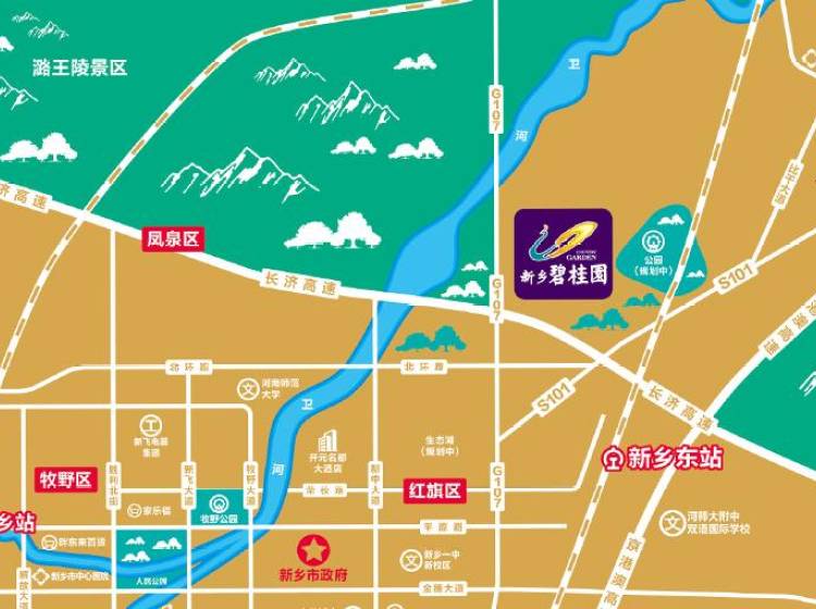 新乡碧桂园位于新乡市新东区101省道东。新东区,一小时,通达全省各地;“零”距离,交通枢纽;两纵两横一轨交汇核心(平原路、金穗大道、东环路、京珠高速、高铁站);40分钟直达新郑机场,省内、省外,国内、国外自由切换。 新乡—卫辉公交(5元);
