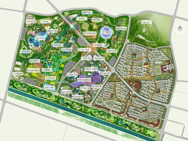 55℃温泉、CC度假酒店、小镇游泳馆、小镇娃娃书房、小镇礼堂、小镇食堂、敬食餐厅、爱丽丝欢乐园、小镇超市。