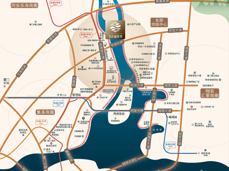 环东海域新城作为厦门未来中心,坐拥枢纽交通体系,5路5桥1隧纵横交通,翔安大道、滨海东大道、滨海西大道、同集路、海翔大道五大主干道畅行;集美大桥、翔安大桥、同安大桥、丙洲大桥、中洲大桥五桥鼎立;地铁4/9号线(在建中),串联同安老城区和厦门岛,接驳厦门北站、高崎机场,快速通连厦漳泉闽金三角城市群。