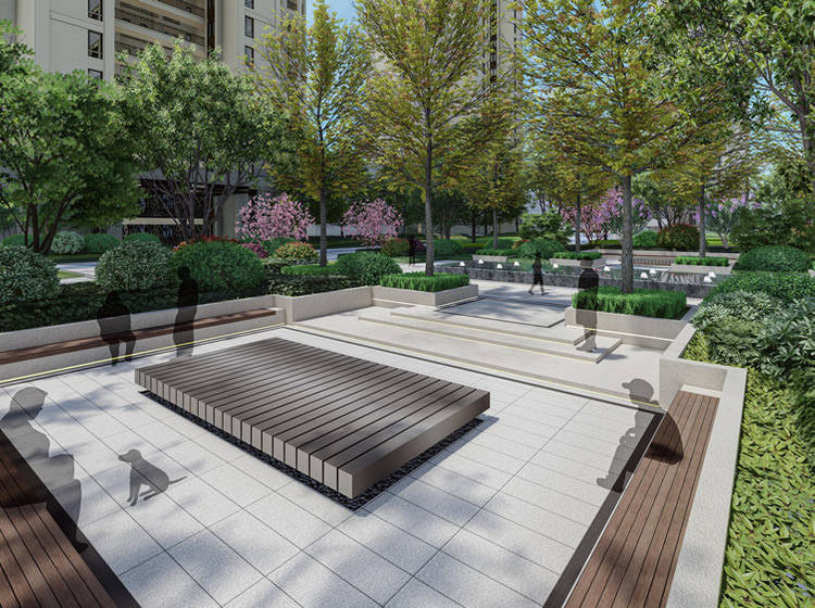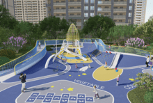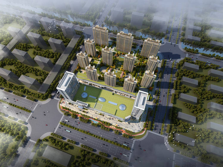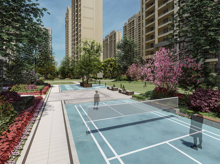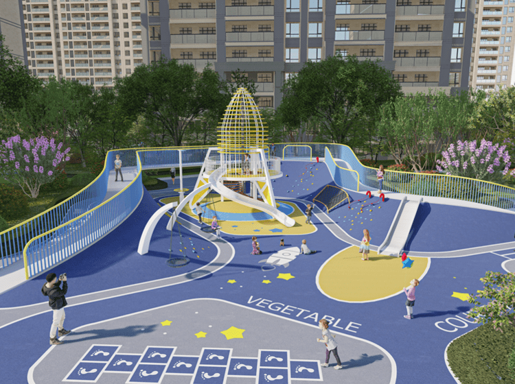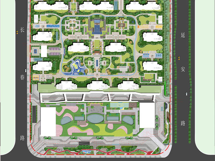 1条中央水系、1条全龄段乐园、3大主题绿地公园、体育运动场