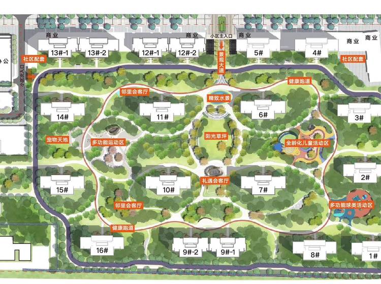 全龄化儿童活动区、老人健身活动区;健康运动:约680米夜光跑道、多功能球类活动区;园林特色:逾2万方超大中央景观带,春夏秋冬“四时园境”;臻心细节:无障碍设计、婴儿车摆放点、隐藏式垃圾点、宠物天地。