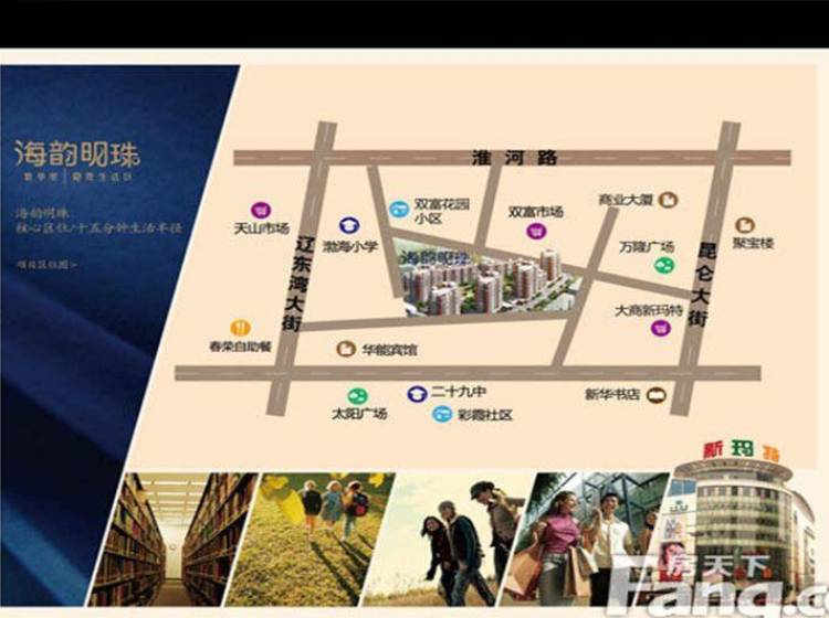 商业:商业大厦,红运商业街,苏宁电器,友谊商城,聚宝楼商场,双富市场。在建的万隆广场,即将动工的新玛特(以上地段步行10分钟随意到达) 教育:西邻滨海小学,二十九中尽在咫尺,南距省实验高中10分钟车程 金融:建行,农行,交行,工行,营口银行,大连银行步行5分钟 物业设施: 会所; 24小时封闭式物业管理; 环境:园林环境