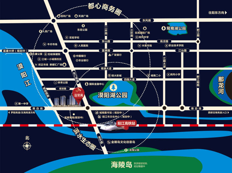 项目位于阳江滨海新区的繁华地段,城市南部的核心位置——东门南路与雅白线交界处,马路对面400米就是高铁阳江站,交通,配套、教育、医疗等各项目都是非常完善的,城南发展已经10年了,区域的发展日渐成熟,生态公园的完善,周边高档的小区住宅,商业、国际金融中心等城市最为核心的人力及资源汇聚于城市南部中心功能区,已是高端人群的最理想的中央生活区,新亚洲风格建筑设计,临漠阳江一线江景洋房,打造瑰丽环境,保证居住品质。