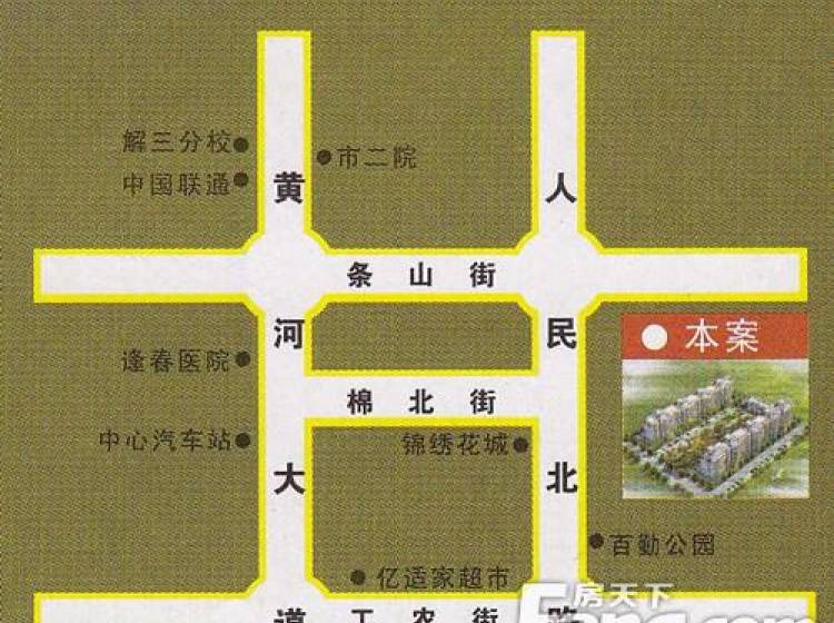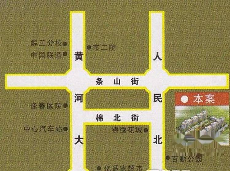 休闲娱乐:百勤公园、亿适家超市、黄河市场、蓝燕大厦 医院:逢春医院,市二院,仁济医院 学校:解三学校 交通:中心汽车站 花园式草坪,曲桥,溪流,花色,廊柱装点社区生活,创造出优美的居住氛围和多层次的景观空间。