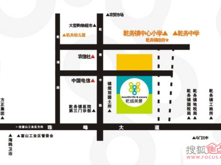 乾城美景位于珠海市斗门区乾务镇乾北村中大围,是乾务镇区的地段,南临珠峰大道。项目300米辐射圈内集聚了乾务镇大部分政府机构及市政配套,东面有一通向珠峰大道的乾兴三路,南面紧临珠峰大道,西面是乾务镇主城区,北面是规划中的乾务镇中心公园和广东省省一级乾务镇中心小学,西北面有长龙山及珠海西部的乾务水库。