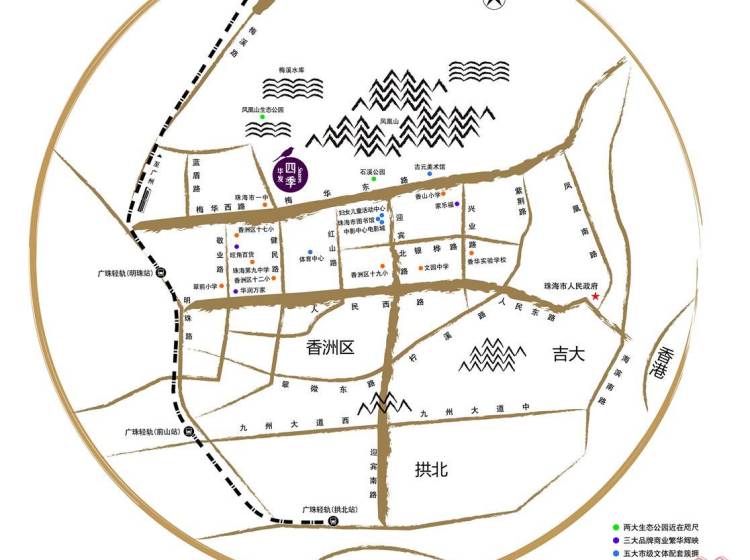 华发四季位处新香洲文体行政核心,梅华西高尚生活区,与主干道保持适当距离,隔绝噪音,宁静私密。周边路网成熟发达,紧邻现已通车的凤凰山隧道,尽显交通枢纽便捷优势。