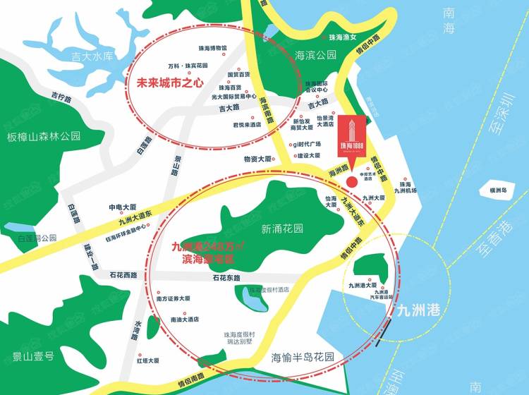 珠海1088位于九州大道东和海洲路交汇处,由央企中国城市建设控股(珠海)有限公司投资开发,总建筑面积101135.88㎡,商业面积11196.88㎡,雄踞珠海主城交通中轴九州大道上,东距海岸线200余米,未来整个项目将成为区域内距离九洲港及港珠澳大桥最近的写字楼,成为集总部办公、海岸购物于一体的深港澳商务起航坐标。