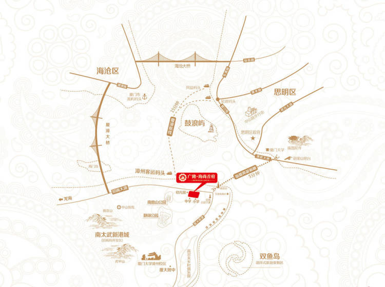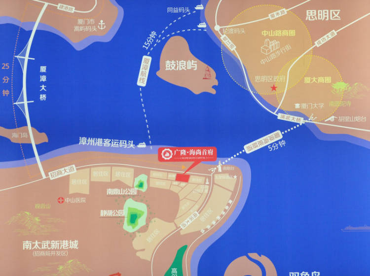 项目交通便利,厦漳大桥已于2013年5月28日通车,驾车可到厦门岛内;海上巴士穿梭厦漳两地;并且项目紧邻规划中的厦漳海底隧道出入口,直达厦门岛,尽享最繁华的中山路商圈配套。