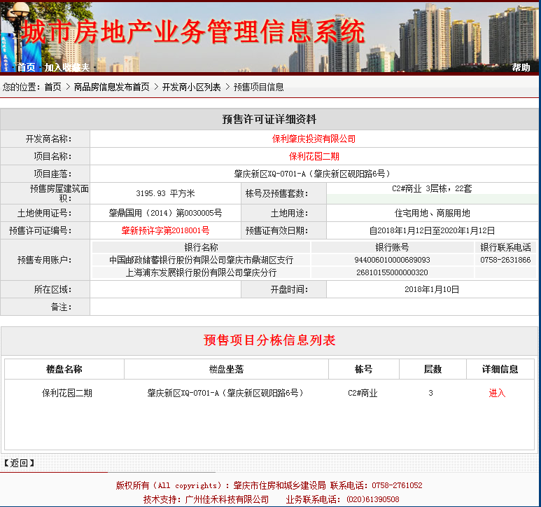 - 肇新预许字第2018001号 详情发证时间 2018-01-12绑定楼栋保利花园二期,C2#商业3层栋,22套证件照片