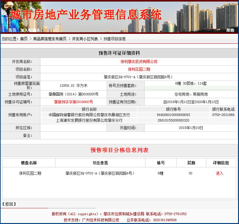 - 肇新预许字第2018002号 详情发证时间 2018-01-12绑定楼栋保利花园二期,6幢30层栋,114套证件照片
