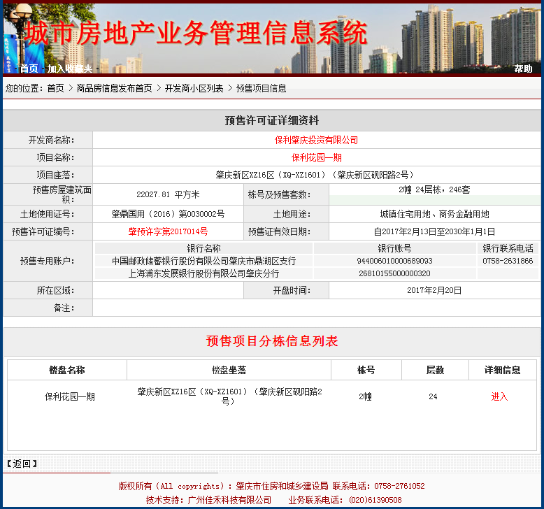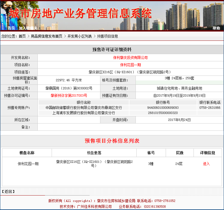- 肇新预许字第2017003号 详情发证时间 2017-09-19绑定楼栋保利花园一期,3幢24层栋,259套证件照片