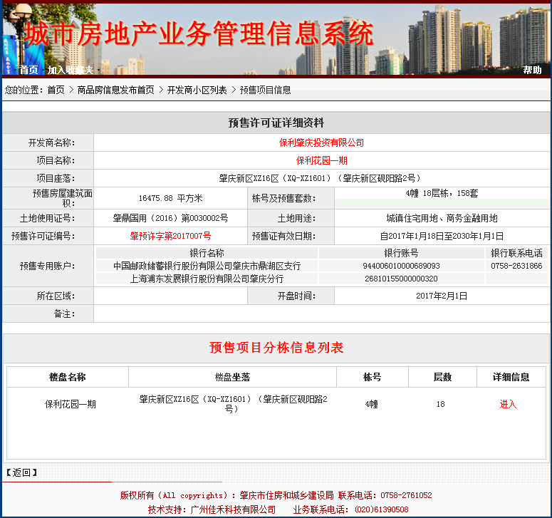 - 肇预许字第2017007号 详情发证时间 2017-01-18绑定楼栋保利花园一期,4幢18层栋,158套证件照片