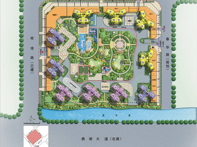 项目自有商业街、双儿童游乐园、全龄化运动设施、泳池、20000㎡中央大花园、羽毛球场