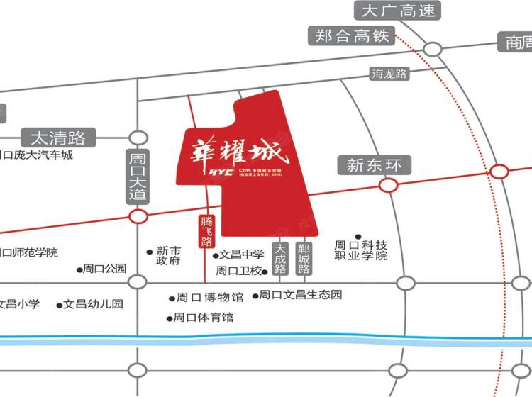 其中,交通配套中,项目南端的文昌大道向东4公里即到大(庆)—广(州)高速主线;周口大道向南与南(京)—洛(阳)高速相连;向北与商(丘)—周(口)高速相接;漯(河)周(口)界(首)高速公路东可直达宁沪杭,西与京珠高速相连,可直达周口国际机场;周口至新郑机场的高速公路正在修建,建成后1小时可直达机场。郑(郑州)合(合肥)高铁已通过国家规划,高铁经停站在本项目东侧开口。另外,荷花市场所有车站都会搬迁至项目大型汽车站。