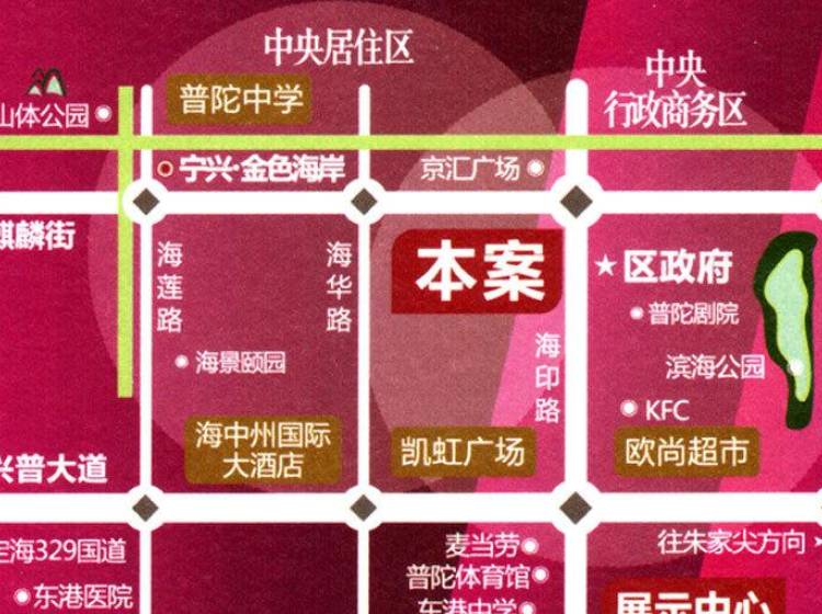 宁兴海天国际广场位于普陀东港开发区二期,普陀区政府对面,由舟山宁兴天润置业有限公司开发。项目周边有东港欧尚超市、港汇广场、普陀中学、凯虹广场、海中洲国际大酒店、普陀中医院等等。宁兴海天国际广场位于东港开发区中心地带,距朱家尖仅仅几车程。宁兴海天国际广场包含的物业类型有精装SOHO,写字楼,商业街商铺,星级酒店等,是一个集居住、办公、娱乐的城市综合体。