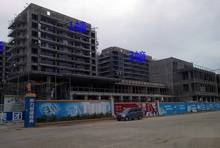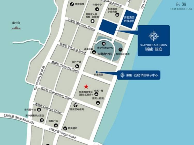 浙能·蓝庭位于舟山市普陀区东港新区,地块名35-1,与普陀山隔海相望,南面为建设中的内湖商圈,西侧为人民医院和普陀中学。由浙能集团、东港集团联合打造,总占地面积5.4万多平方米,总建筑面积约为11万平方米,其中地上包含商业与住宅,其中住宅建筑面积约为5.5万平方米,商业建筑面积约为1.9万多平方米。项目开发涵盖11幢高层住宅(其中5幢带底层商铺)、2幢独立沿街商铺,容积率1.4,建筑密度32%,绿地率27%,车位配比率〉1:1。规划住宅542户,户型面积89-180平方米,商铺约76户,户型面积50平方米起。住宅以玻璃幕墙和石材相结合的新一代高层公寓产品。 浙能·蓝庭拥有品牌团队设计,规划建筑由绿城设计担纲,景观设计则是由加拿大奥雅圆境师事务所承担,前期物业也是请了绿城物业,所以也可谓是强强联合,作为浙能集团在舟山推出的个项目,也是集所有优势于一身,为东港,为普陀,为新区,呈现一个好的作品。