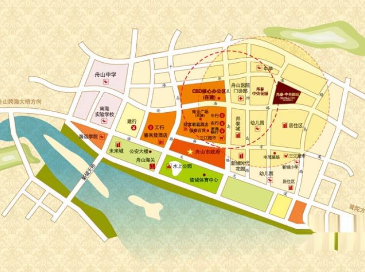 学校:新城中心幼儿园、舟山第一小学、洞岙小学、洞岙中学; 医院:舟山医院临城分院; 银行:中国银行、农业银行、工商银行、浙商银行等; 购物休闲:乐购、银泰百货、三江超市、临城体育馆等。 中心景观,西侧景观公园等。