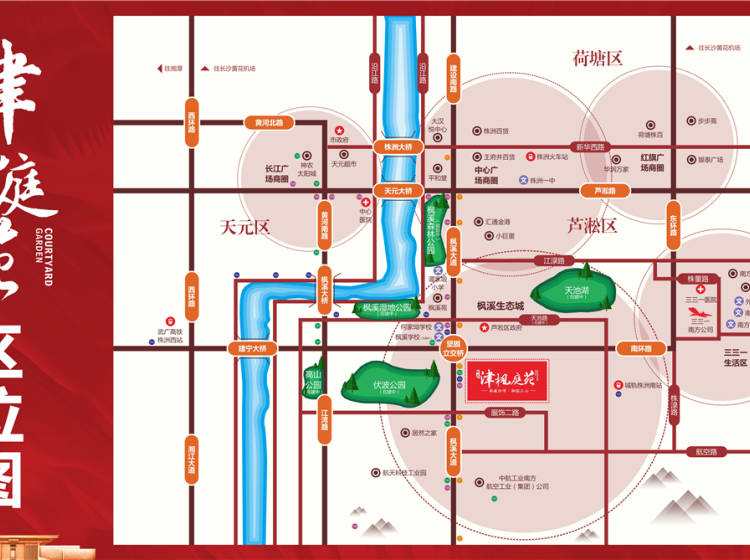 项目位于中心城区南部、紧邻芦淞区政府,在枫溪大道与服饰二路交汇处东北面。项目交通四通八达,形成以环线、过江大桥、轻轨、城铁,多方位于一体的交通路网。项目占地59498㎡,总建筑面积148584㎡,容积率仅1.9,建筑密度仅14.83%,是市场上难能可贵的低容积率、低密度品质大盘!项目自身有一座原生山林,绿地率高达43.41%。由9栋高层住宅和临街商业裙楼组成。景观更是别具匠心,以“新亚洲风”勾勒特色景观,尽享四时浪漫;以”九院”构筑府院宅邸,尊享格调生活; 5星级酒店式大堂入户,恢弘大气彰显豪门气度。在这里既能享受到枫溪生态城的宜居环境、便捷的交通路网、优质的精英教育,以及完善的商业配套!