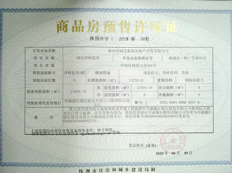- 预许字(2019)第361号 详情发证时间 2019-08-22绑定楼栋芦淞区枫溪大道368号城发津枫庭苑4栋