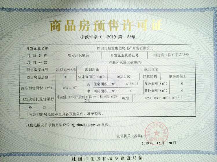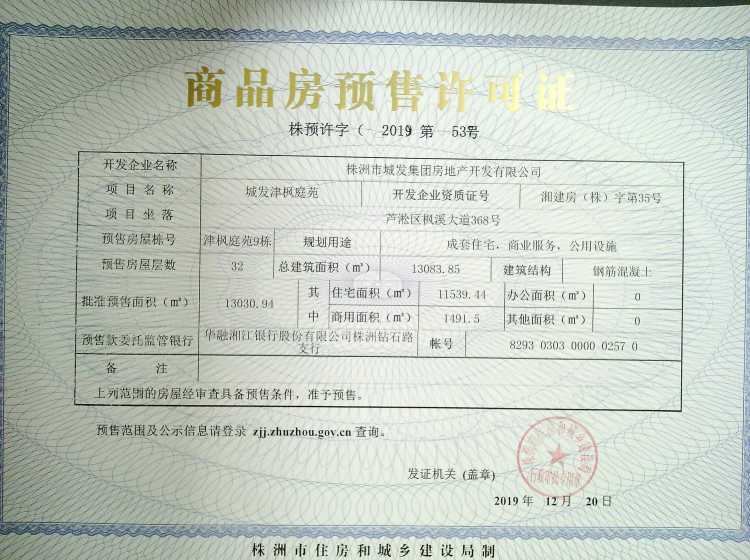 - 预许字(2019)第537号 详情发证时间 2019-12-20绑定楼栋芦淞区枫溪大道368号城发津枫庭苑9栋
