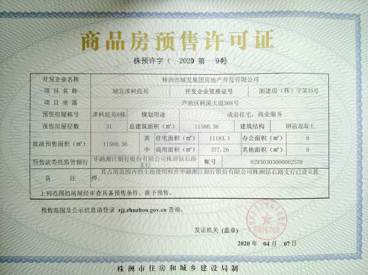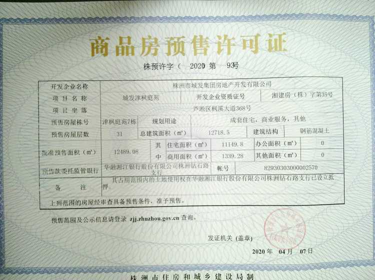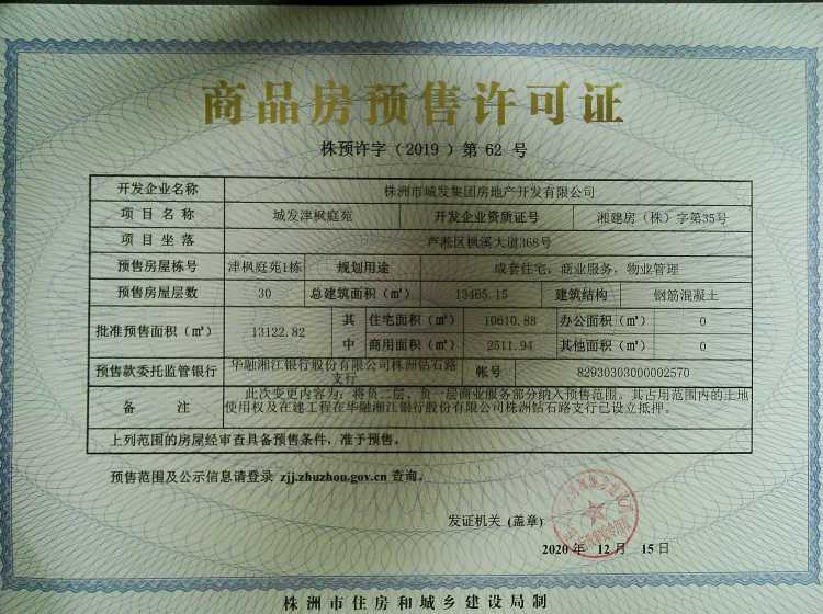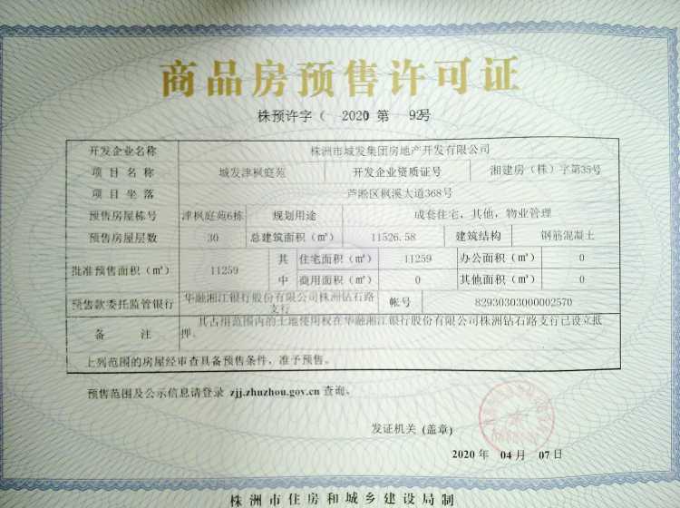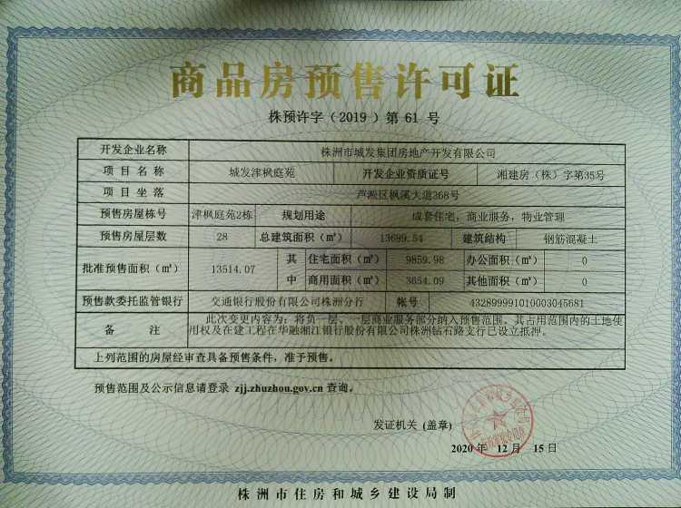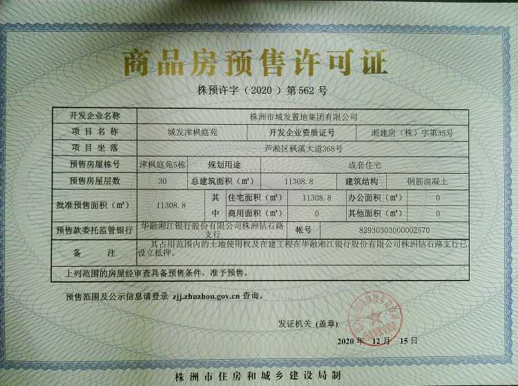 - 预许字(2020)第562号 详情发证时间 2020-12-15绑定楼栋芦淞区枫溪大道368号城发津枫庭苑5栋