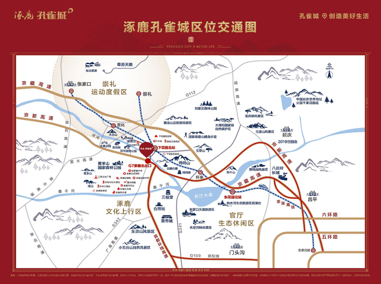 涿鹿孔雀城项目交通区位良好,用地周围有京藏高速、 京新高速和342省道等多条交通干线。京张城铁设下花园高铁站,实现项目到北京城区的零距离。