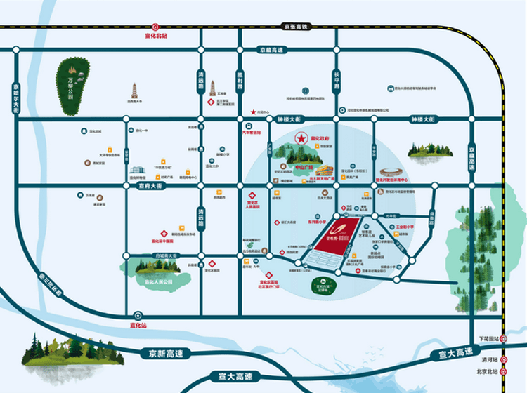 位于宣化开发区城市主干道宣府大街南侧500米,距离 宣化区政府直线距离800米,宣化区境内有110、112、207三条国道,宣大、京 藏、张石、张承、京新五条高速,京包、大秦、宣庞及京张城际 、蓝张、张唐六条铁路,距张家口机场仅20公里,已形成集公 路、铁路、航空于一体的现代立体综合交通体系。京张城际铁路通车后,京宣两地车程将大大缩短。