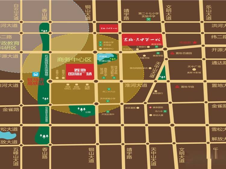 驻马店置地国际广场由河南省置地房地产集团开发, 项目总占地面积64亩 ,总建筑面积约16.8万平米,其中地上建筑面积约13万平米;平均容积率约3.093。由甲级写字楼、SOHO写字楼、公寓、酒店、住宅、商业步行街等多种业态构成。与相邻地块互补互成,营造集商务创意、生活购物、休闲娱乐为一体的新型城市综合片区。本项目从地域性出发,融合艺术创意、自然景观与购物休闲中的核心元素,实现人流的共享和互通。力求打造一座集居住、工作、购物、休闲、娱乐、运动和餐饮等多功能集约型高效率的新兴开放式社区。