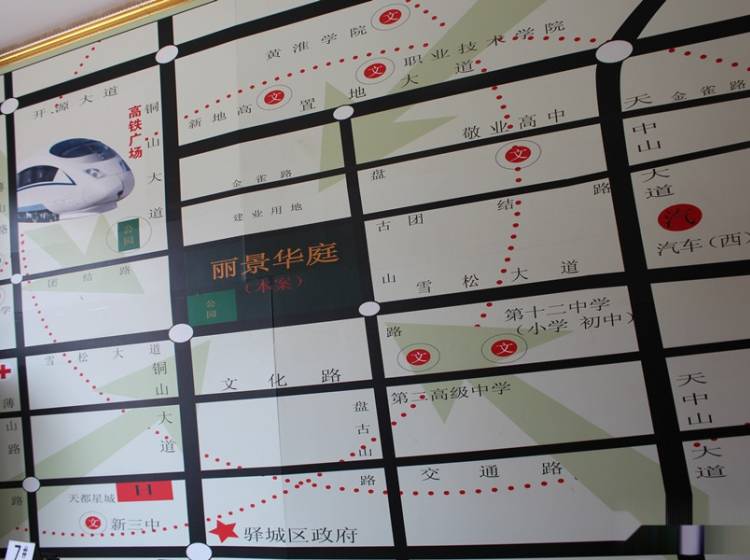 行政单位:南面有区委、区政府等; 企事业单位:西门有驻马店市有几家大型企业,比如康茂、华骏、顶志等; 绿化占地:铜山大道将修建成新的一条景观大道,路两旁有近40米的绿化带,加上小区内的绿化面积有近3万平米的绿化,另外,我们这个小区最大特点是超宽楼间距3A号和5号楼宽约80米,在驻马店市区是不多的,3号和3A号楼60多米,1、2、3号楼宽约40米。 教育资源:本小区有专属幼儿院、附近有市二高、第十二中小学、北面还有新地高、敬业高中职业技术学院、黄淮学院等; 幼儿园 休闲公园