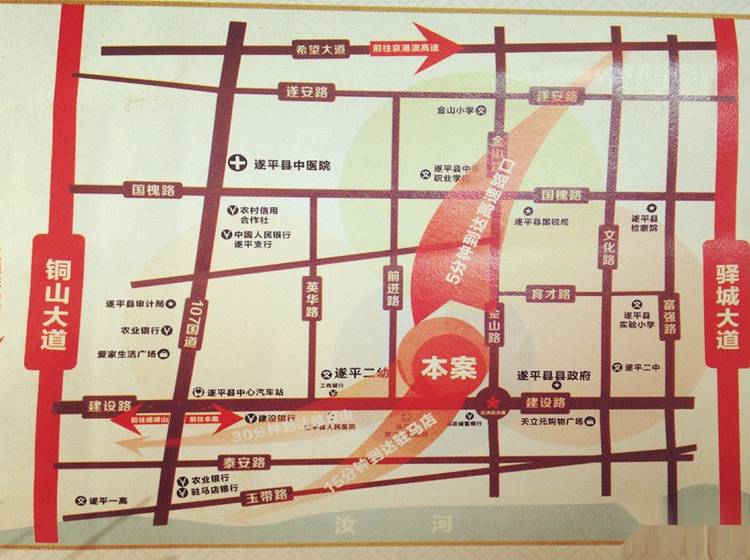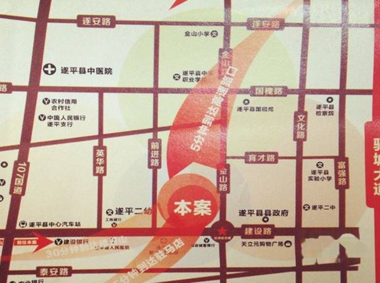 爱家超市 遂平一中、金山幼儿园、小天才幼儿园、二小 县医院、第二人民医院 农业银行、建设银行、中原银行 酒店、商场、商业街