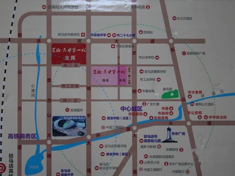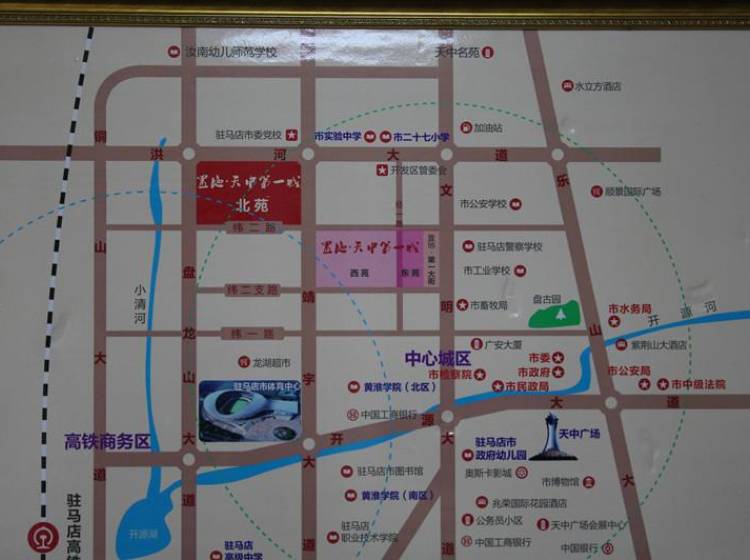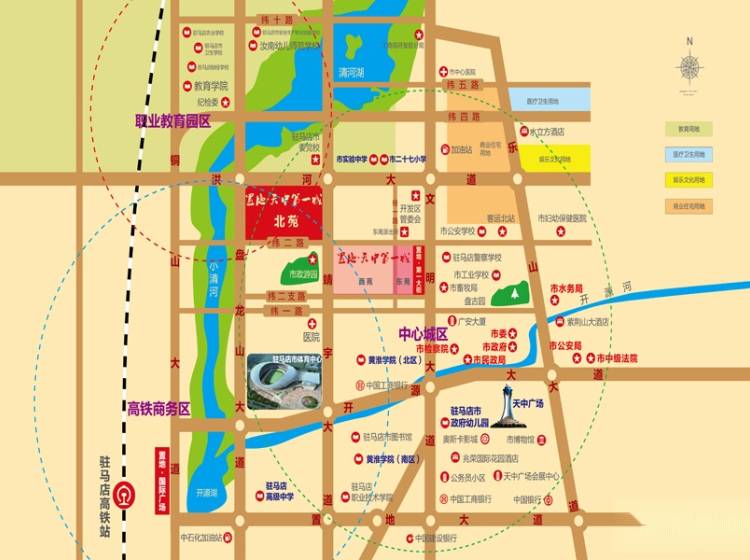 市委、市政府及各市直机关单位、天中广场、会展中心、体育中心 黄淮学院、驻马店高级中学、市实验中学(含小学部)、市八中、开发区一小, 园林景观,休闲娱乐场所,观景高层、风情商业街、时尚星级酒店、名品购物广场、双语幼儿园组成