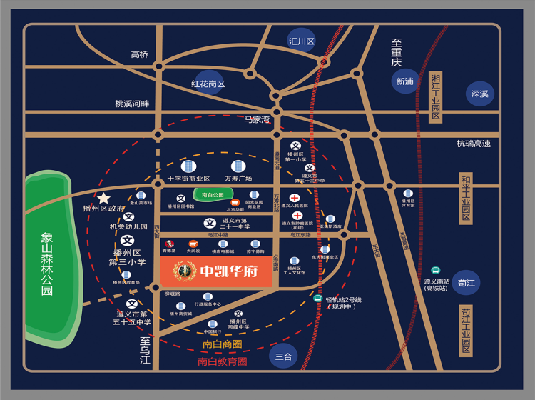 项目位于播州区南白镇南部,北接大润发广场,南通往乌江组团中的三合镇,轻松连接核心区与边缘区,坐享遵义南城的规划资源等红利,是遵义未来发展核心区,更是遵义南城核心枢纽生活区。