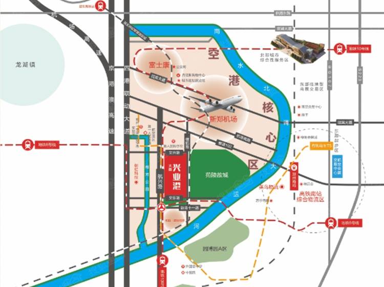地铁:R6支线、M10号线航兴路交汇有轨电车T5,2号线郑州南站轻轨零换乘,10分钟达CBD;