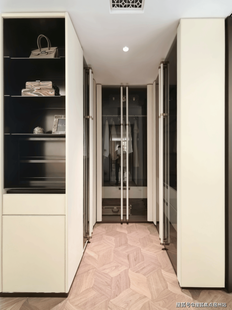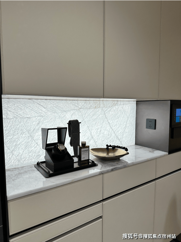 通过示意图我们会看到,一般项目的玄关柜处于成本原因只会做到下图中间位置的冰箱位置就结束,而外滩源著在标配的双开门冰箱(小户型博世或同等品牌、大户型利勃海尔或同等品牌)左侧还额外交付有完整的储物空间:进到实地约99平样板房,整个玄关柜几乎全部都是皮质缝线包裹,细节拉满;打开柜门, 内外都是皮革包裹,质感进一步提升:进到主卧,L形衣柜同样是交付标准,抽屉部分和半开放水吧台位置全部都是交付标准; 在全上海99%的同价位样板房里,卧室衣柜都是非交付的。在今年上半年大家都在卷人字拼地板的基础上,外滩源著主卧地板升级为 柳叶拼接,进一步做了升级:看到约143平户型,厨房岛台和上柜都不稀奇, 厨房外的半开放式餐边柜和利勃海尔内嵌式同样也作为交付标准附赠,柜体额外提供接近1立方面积的收纳空间:在约143平户型中,入户玄关收纳区被分为2个部分——一个是进门正对的区域,一个是进门后的步入式区域,两侧都标配有充裕的收纳空间。和约99平户型不同,约143平户型在玄关柜末端还设置有半开放水吧台,丰富生活场景:主卧和约99平户型一样,衣柜更大形成衣帽空间,还交付有半开放式、类似于酒店的迷你吧设计:现场样板房照片长这样:收纳空间全部都是来自博洛尼专属定制(或同等品牌),真正做到拎包入住、省去后期定制比价的烦恼;而在收纳空间之外,外滩源著在用料上同样可以称得上卷王——项目厨房台面是 全进口的西班牙DEKTON品牌:厨房为 美诺三件套交付,这和之前浦江之星保持一致;冰箱小户型为博世、大户型为利勃海尔,都是双开门设计;基础硬件都不差,项目在审美上还做了不少创新——卫生间大量采用奢石和石材,比如主卫柜体墙面就是 香格里拉翡翠拼花,龙头是冷热分离式,成本更高:次卫则是采用不同风格,墙面统一采用米洞岩板、地面为深咖色瓷砖,黑金配色风格区别于看多了的海派设计,眼前一亮:卫生间下柜同样是皮革包裹交付,标配智能马桶盖板:入户玄关处的开放格背板采用罕见的 白冰玉石材利用人造光源,通过石材的反射和折射,纹理清晰分明;