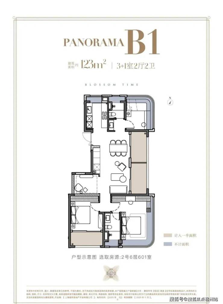 建面约123㎡4房,三阳台面积达约14.7㎡(赠送一半),5飘窗赠送高达约10.4㎡,室内使用面积约117.8㎡,实得率高达约96%,总赠送面积相当于两个次卧。